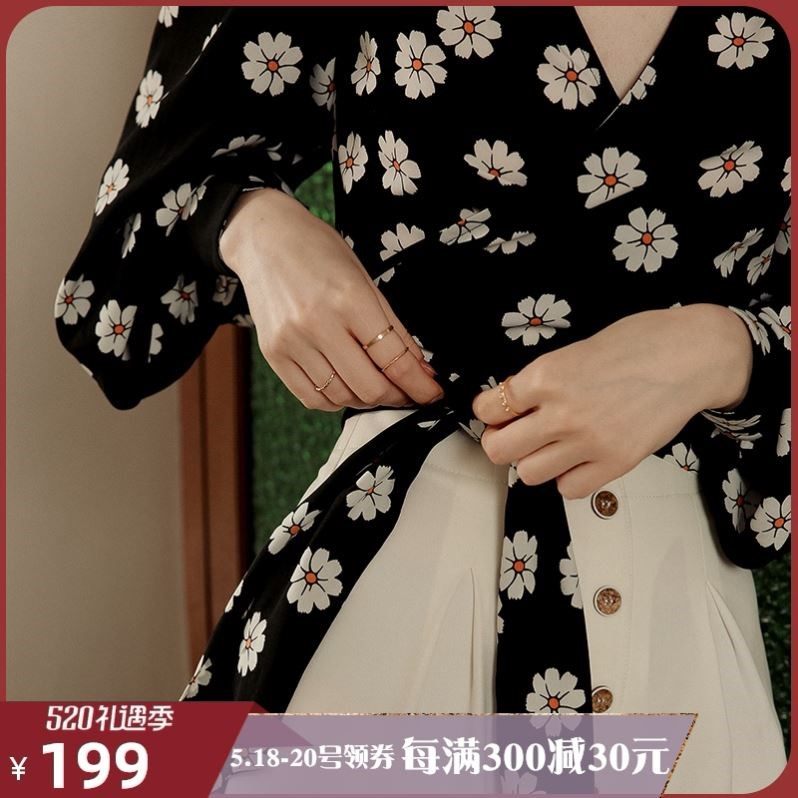锁骨上衣心机设计感雪纺衫洋气黑色灯笼长袖印花收腰短款小衫女秋热门设计联盟服务商